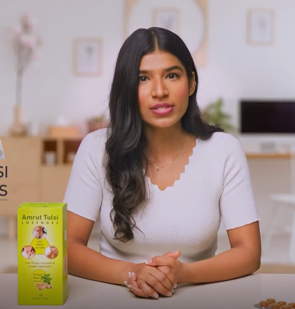 Doctor-recommended herbal relief for cough, cold, and sore throat —Amrut Tulsi works effectively.