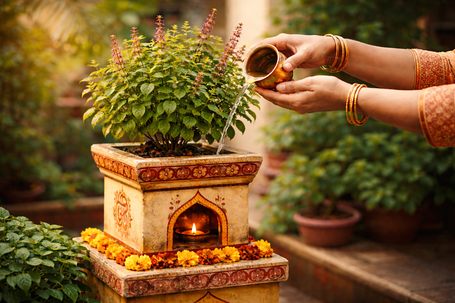 Tulsi was honored in Vedic ceremonies as a sacred offering to the gods.